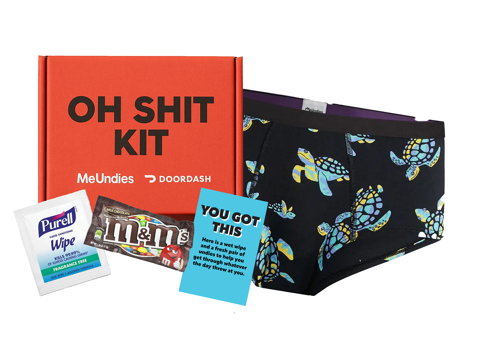 When life hits the fan, MeUndies and DoorDash deliver the ultimate rescue drop: fresh undies, wipes, snacks, and a morale-boosting note. The “Oh Shit Kit” because sometimes… yeah, you need one.